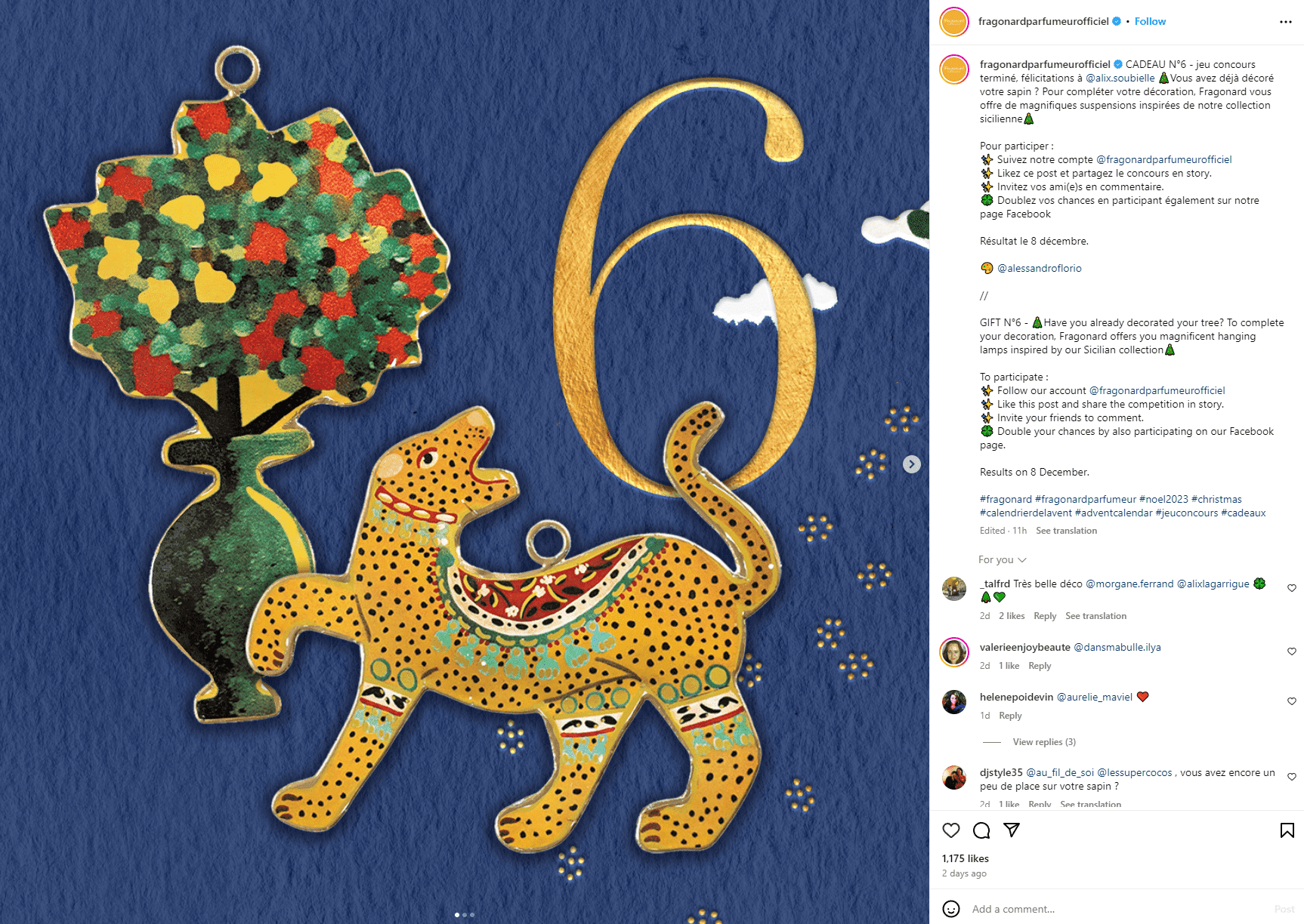 Fragonard's Instagram strategy, particularly their holiday-themed posts, demonstrates a strong alignment with seasonal trends, enhancing brand relevance and appeal. However, a key area for growth lies in their interaction with followers. Increased engagement, such as responding to comments and messages, can foster a more vibrant and loyal community. By balancing thematic content with proactive audience interaction, Fragonard can further elevate its brand presence on social media, making it more relatable and approachable to its audience. This strategy could lead to deeper customer relationships and enhanced brand loyalty.